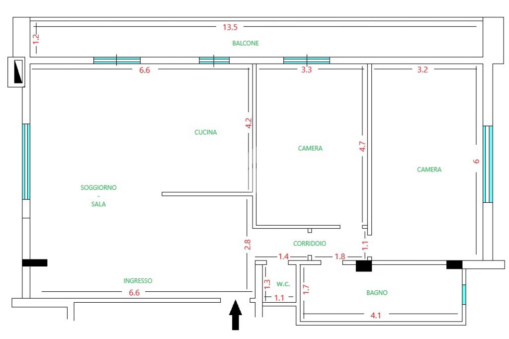 L'immobile è composto da un'ampia zona giorno, comprendente ingresso, sala, cucina e bagno di servizio. Nella zona notte troviamo camera da letto padronale, cameretta e bagno finestrato con doccia e vasca. Balcone di circa mq 16 con accesso dalla zona giorno e dalla camera padronale.