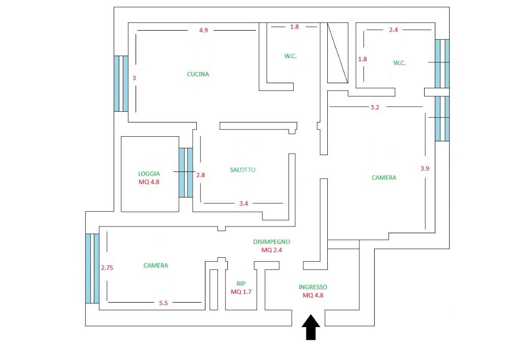 Composto da ingresso, disimpegno, cucina abitabile, salotto con condizionatore, camera padronale con bagno in camera finestrato, cameretta, bagno con finestra e ripostiglio.