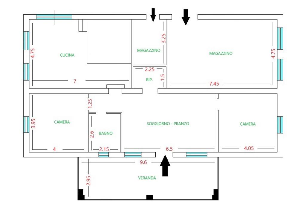 Immobile composto da ingresso, soggiorno-pranzo, cucina, camera padronale, cameretta, bagno con finestra e ripostiglio. Veranda d'accesso di circa mq 30.
