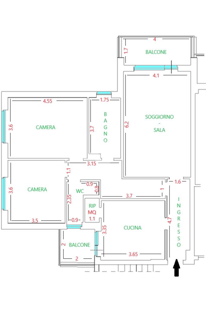 Composto da ingresso, cucina abitabile con ripostiglio e balcone di circa mq 4, soggiorno pranzo con balcone pertinenziale di circa mq 7, due camere da letto e doppi servizi con finestra.
